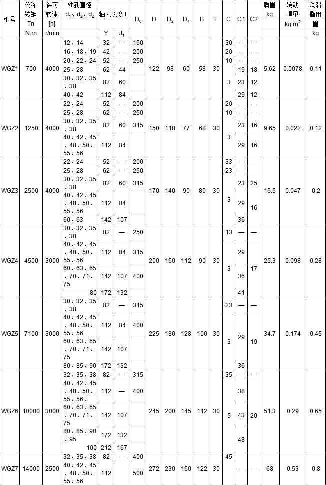 WGT型--接中間套型,適用于兩軸長距離聯(lián)接,許用轉(zhuǎn)速[n]取決于中間套的長度和質(zhì)量,并應(yīng)驗(yàn)算臨界轉(zhuǎn)速;