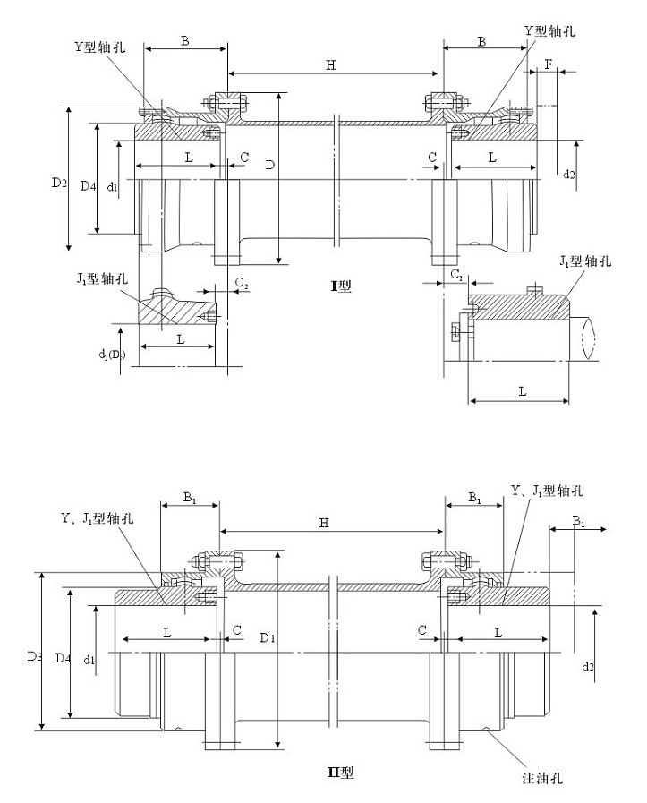 II型--密封端蓋為整體型,齒間距小,相對(duì)允許徑向位移小,結(jié)構(gòu)緊湊,轉(zhuǎn)動(dòng)慣量小,可與Y、J1型軸伸聯(lián)接;
